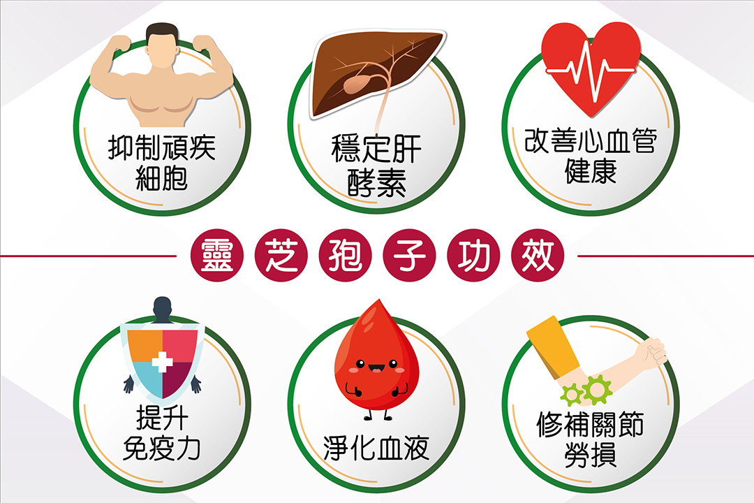 灵芝孢子含有嘅灵芝酸(Ganoderic acid)同灵芝三萜(Triterpenoid)对肝损伤有保护作用,可提升肝细胞嘅抗氧化能力,有效清除自由基,亦增强肝脏代谢药物嘅解毒功能,减低毒素对肝脏嘅损害。